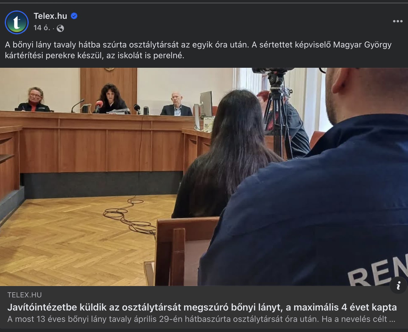 "A maximális 4 év javítóintézeti nevelést szabta ki a Győri Törvényszék a bőnyi lányra, aki tavaly április 29-én, hatodikosként otthonról hozott késével hátba szúrt óra után egy másik lányt. A sértett súlyos életveszélyben volt." részlet a Telex cikkéből.